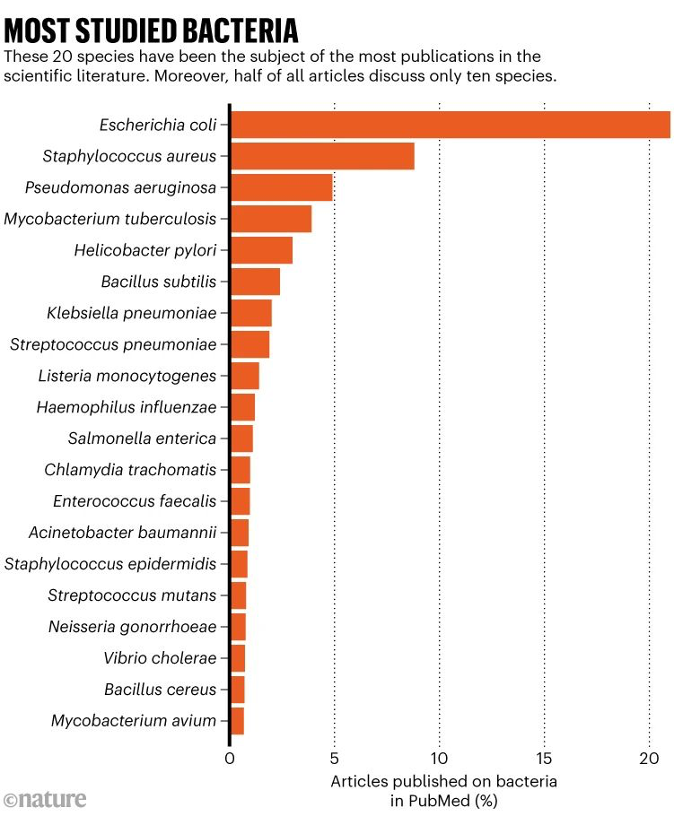 Şaşırtıcı olmayan bir şekilde, E. coli, toplamın %21’i olan 312.000’den fazla yayınla zirveye çıktı. İlk 10’un geri kalanı esas olarak fırsatçı bir enfeksiyon olan Staphylococcus aureus, Mycobacterium tuberculosis ve ülserlere ve hatta kansere neden olabilen bir mide mikrobu olan Helicobacter pylori gibi insan patojenlerinden oluşuyordu (bkz. “En çok çalışılan bakteriler”).