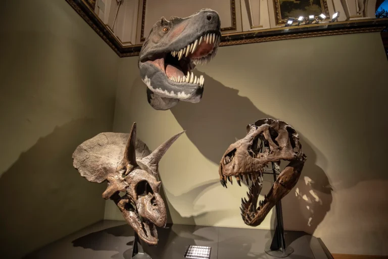 (Üstten saat yönünde) Avusturya’nın Viyana şehrindeki Doğa Tarihi Müzesinde sergilenen bir T. rex modeli, T. rex kafatası ve Triceratops kafatası. Fotoğraf: Depositphotos
