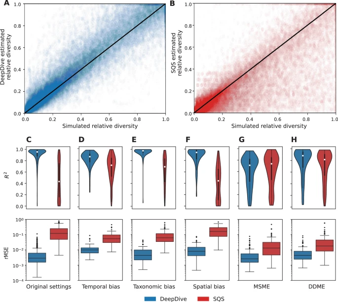 DeepDive’ı fosil verilerinden çeşitlilik yörüngelerini tahmin etmek için en yaygın olarak uygulanan yöntemlerden biri olan SQS 19 , 27 ile karşılaştırdık 48 , 49 , 50 , 51. SQS göreceli çeşitliliği tahmin ettiğinden, performanslarını karşılaştırmak için rMSE ve R2 ölçümlerini kullandık. Analizde, DeepDive ile eğitilen modeller, test simülasyonları boyunca birden fazla büyüklük sırasına göre daha düşük göreceli medyan rMSE ve daha yüksek bir medyan belirleme katsayısı (0,958’e karşı 0,432) ile SQS’den daha iyi performans gösterdi (Şekil 2 ). Özellikle, DeepDive tahmini verilerdeki boşluklara karşı daha dayanıklı görünüyor ve hem düzgün hem de ani çeşitlilik değişiklikleri dahil olmak üzere genel biyoçeşitlilik dinamiklerini daha iyi yakalıyor gibi görünüyor (Ek Şekil 3 ). Hem DeepDive hem de SQS tahminleri düşük düzeydeki tamamlanma ve koruma oranlarından olumsuz etkilenirken (Ek Şekil 5 ), DeepDive örnekleme senaryolarının tüm spektrumunda önemli ölçüde daha doğru tahminler sürdürdü (Ek Şekil 4 ).