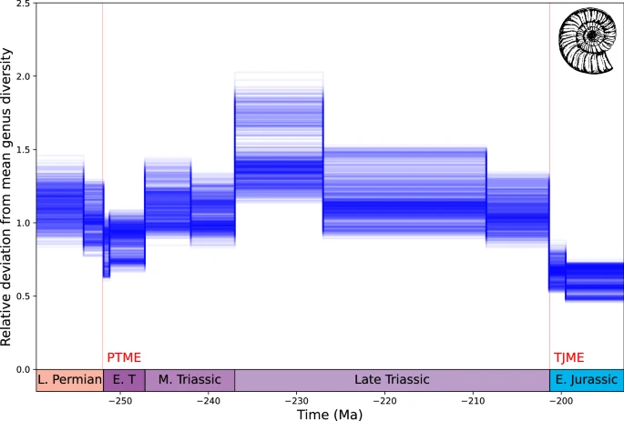 Deniz çeşitliliği Geç Permiyen ile en erken Triyas arasında azalır ve Permiyen-Triyas kitlesel yok oluşu (PTME) sırasında cinslerin %58’ine kadar kayıp yaşanır (Şekil 6 ), ancak daha düşük büyüklükler de mümkündür (ortalama %24 cins kaybı). Erken Triyas’ta cins sayısı kurtarıldı ve Orta Triyas’ta PTME öncesi seviyeleri aştı. Çeşitlilik Geç Triyas boyunca daha kademeli olarak azalır ve ardından cinslerin %66’sına kadar kayıpla (ortalama %42 cins kaybı) Triyas-Jura sınırında daha keskin bir düşüş görülür.