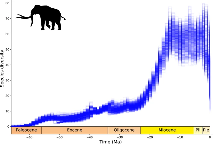 Hortumlular kladının çeşitlenme geçmişini Erken Senozoyik’teki (66-60 Ma) kökeninden bu yana tahmin ettik ve zaman içinde kademeli bir çeşitlilik artışı olduğunu ve Miyosen’in başlangıcında tahmini tür zenginliğinin 10-20 türe ulaştığını çıkardık (Şekil 7 ). Erken Miyosen’de (23-15 Ma) çeşitlilikte dik bir artış tespit ettik ve bu da Orta ila Geç Miyosen’de Dünya’da dolaşan 35-78 kadar çağdaş fil türüne yol açtı. Çeşitlilik, çalışma aralığının sonunda 10-27 türle Pleyistosen boyunca çökmeden önce Pliyosen’de ve Pleyistosen’in başında nispeten yüksek ve değişken kaldı (ortalama %65 tür kaybı, maksimum %87, minimum %32). Bu yeniden yapılanmanın ışığında, üç türün günümüzdeki çeşitliliğinin, Pleyistosen’den (2,58 milyon yıl önce) bu yana %70’in üzerinde tür kaybından kaynaklandığı görülmektedir (maksimum kayıp %89, ortalama %85).