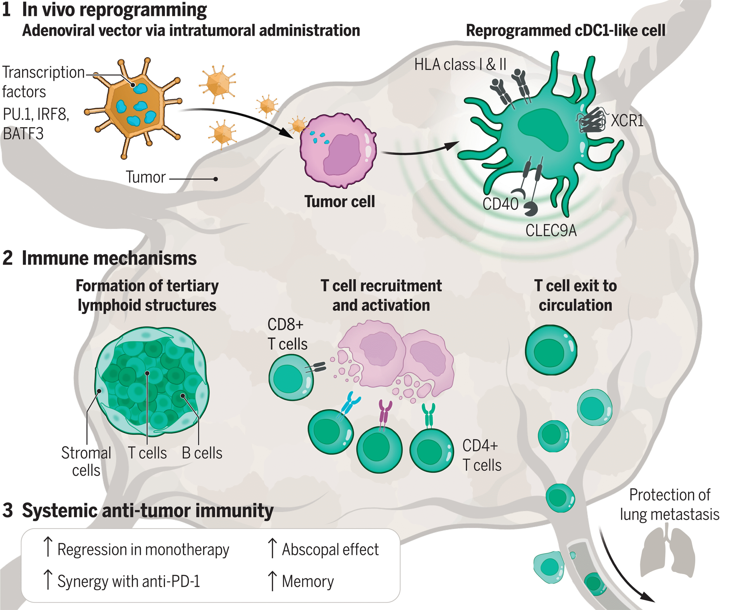 In vivo tümör hücresi yeniden programlaması, in vitro yaklaşımlara kıyasla daha hızlı kinetik ve daha yüksek doğruluk gösterdi ve olgun, immünojenik bir imza gösteren tümör yerleşik cDC1 benzeri hücrelerle sonuçlandı. İmmünsüpresif kanser ilişkili fibroblastların, miyeloid kökenli baskılayıcı hücrelerin veya perisitlerin varlığına rağmen insan kanser kürelerinde yeniden programlama etkili bir şekilde ilerledi ve T hücresi aktivasyonuna ve tümör hücresi eliminasyonuna yol açtı.