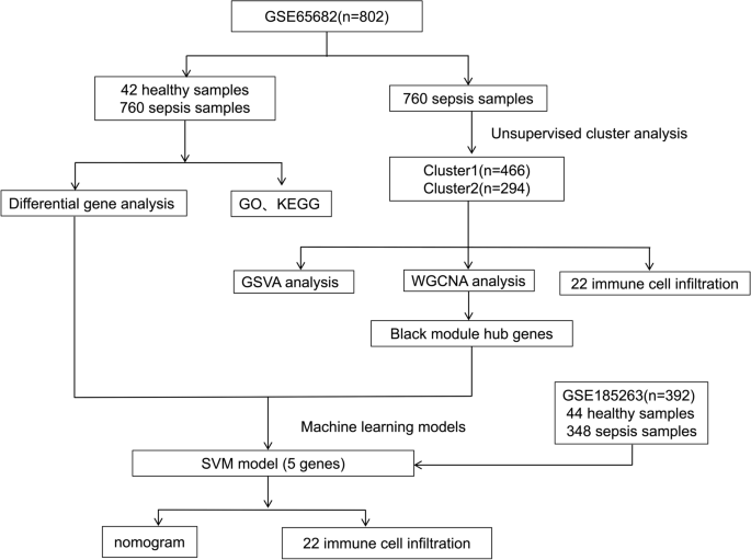 Biyoenformatik analizlerinin ayrıntılı yöntemleri, önceki çalışmalarda açıklanan sürece benzerdi [ 13 , 14 ]. Özetle, GSE65682 veri setindeki sepsis örnekleri üzerinde DRG ekspresyonuna dayalı olarak gözetimsiz kümeleme gerçekleştirildi. Bağışıklık hücresi oranları CIBERSORT algoritması kullanılarak tahmin edildi ve bağışıklık hücresi dağılımları görselleştirildi. DRG ekspresyon seviyeleri ile bağışıklık hücresi fraksiyonları arasındaki ilişkileri değerlendirmek için Spearman korelasyon katsayıları hesaplandı. Ağırlıklı gen eş-ekspresyon ağı analizi (WGCNA), eş-ekspresyonlu gen modüllerini belirlemek için en değişken genlerin ilk %25’ine uygulandı.