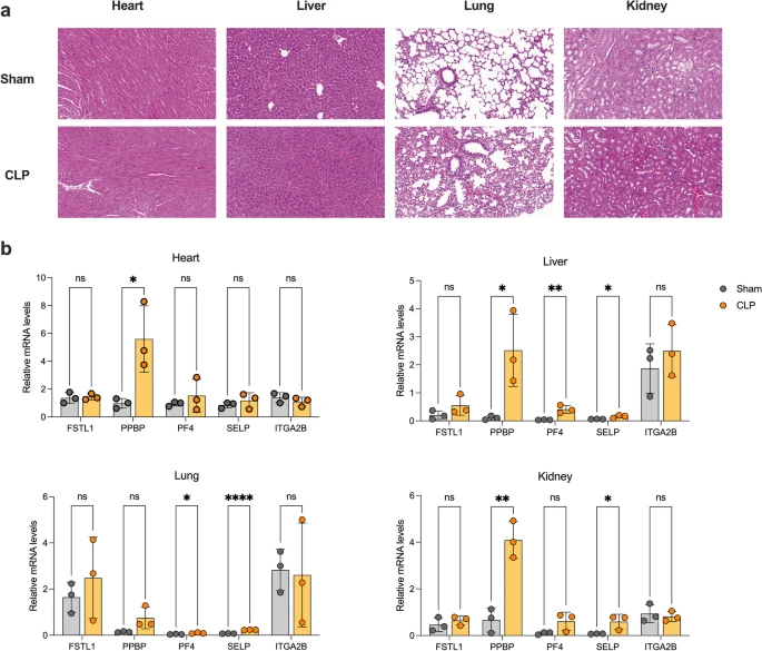 Histopatolojik inceleme, CLP fare modelinde temel hedef organlarda (kalp, karaciğer, akciğer ve böbrek) sepsis kaynaklı doku hasarını doğruladı (Şekil 11a ). PCR sonuçları, septik fareler ve sahte farelerden alınan tüm dokularda FSTL1 ve ITGA2B’nin benzer mRNA seviyelerini gösterdi. Bununla birlikte, PF4 , septik farelerin hem karaciğer hem de akciğer dokularında önemli ölçüde yukarı regüle edilirken, SELP karaciğer, akciğer ve böbrekte yükselmişti (Şekil 11b ). PPBP ekspresyonunun septik hayvanlarda analiz edilen tüm dokularda sürekli olarak artmış olması, sistemik bir biyobelirteç olarak potansiyelini desteklemektedir.
